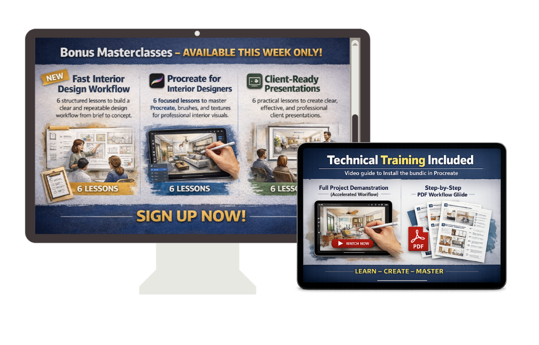 The ultimate Procreate toolkit for architects and interior designers who want to create stunning projects without wasting hours searching for scattered resources.